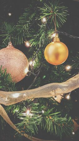Balls and garlands hanging on pine branches on festive backdrop. Golden baubles on spruce tree. Christmas background. Merry Christmas and Happy New Year holiday postcard. Festive decoration pattern