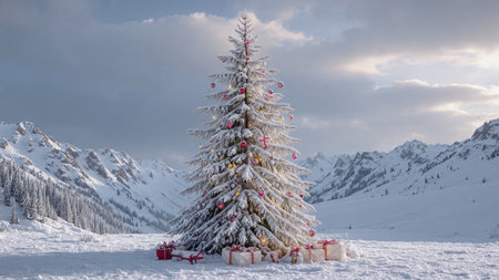 Snow-covered Christmas tree adorned with colorful ornaments, showcasing festive decorations and a winter wonderland atmosphere