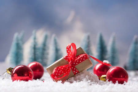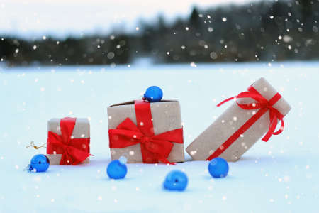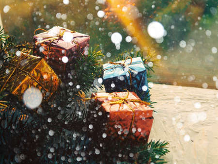 Festive christmas gift boxes and miniature snow covered trees on snowy ground with glowing holiday lights in the winter background.