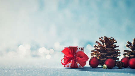 Beautiful simple Christmas background with copy space. Cute Christmas present, red ornaments and pine cones on shiny blue background with defocused christmas lights.