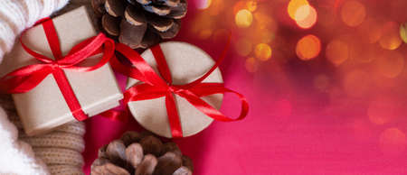 New years banner. Light, knitted sweater with cones and gift boxes tied with a red ribbon on a red background. Side view. Space for text. Soft image with bokeh.