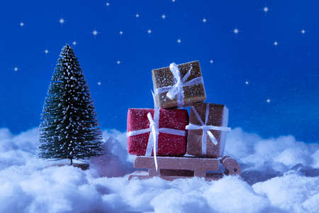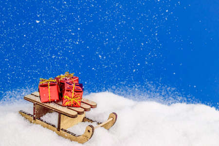Christmas sledge in snow with red xmas gifts under snowflakes on blue background. Christmas and New Year concept. Christmas greeting card.