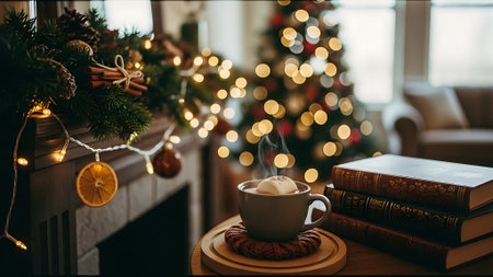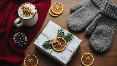 A cozy holiday scene featuring a wrapped gift, a cup of coffee topped with whipped cream, dried orange slices, and festive decorations like stars and greenery