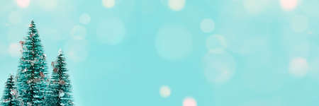 Trendy Christmas banner in pastel mint colour - Christmas tree or New Year tree with decorations and bokeh lights on green background with copyspace for your text. Selective focus, place for text