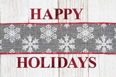 Happy Holidays message sign with gray and white snowflakes on with weathered wood