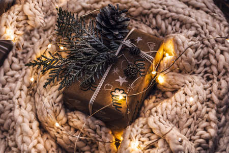 Christmas handmade gift in a Christmas garland and cones lies on a woolen scarf, Christmas miracle.
