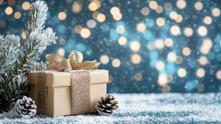 A beautifully wrapped gift box rests atop a snowy surface, surrounded by pine cones and a frosty branch, with shimmering lights in the background. Perfect for holiday themes.