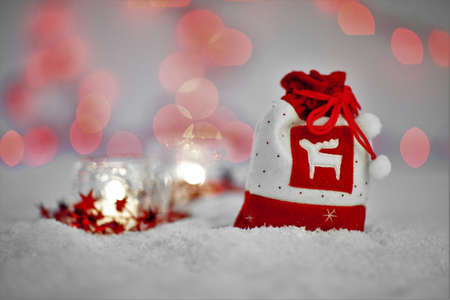 Christmas decorated candle isolated on background with blurred lights. December season, Christmas composition.