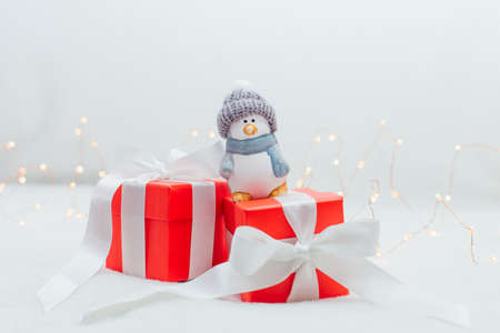 The statuette of a penguin in a knitted hat and red present boxes with a white ribbon on the white background. Festive decor, warm bokeh lights