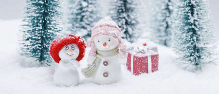 Christmas card snowmen near a Christmas tree with boxes of gifts. Christmas concept.