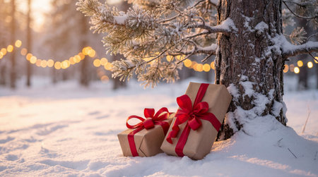 Gift boxes with red ribbons under snowy pine tree at winter sunrise, festive holiday atmosphere with warm glowing lights in background.