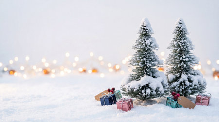 Snow covered christmas trees with festive decorations and wrapped gifts in a serene winter landscape with blurred holiday lights.