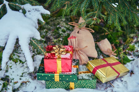 Gifts in red boxes decorated with ribbons are lying under the Christmas tree in the new year