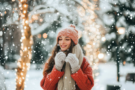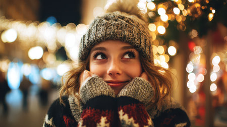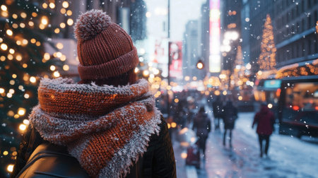 A lone figure wearing a knitted hat and scarf stands in a snowy urban setting, absorbing the enchanting city lights and festive decorations.
