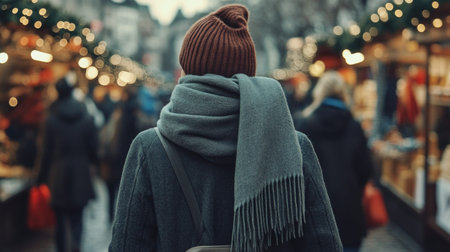 A cozy scene capturing a person with a brown beanie and grey scarf enjoying a colorful holiday market filled with festive decorations and cheerful crowds.
