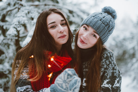 Two young teenage hipster girl friends together.Close up fashion portrait of two sisters hugs and having fun winter time,wearing sweater,best friends couple outdoors, snowy weather
