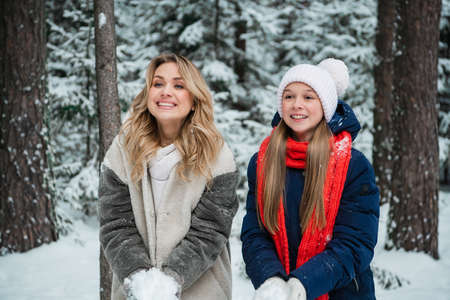 Cute teen girl and her mother play with snow during a winter walk in the forest.