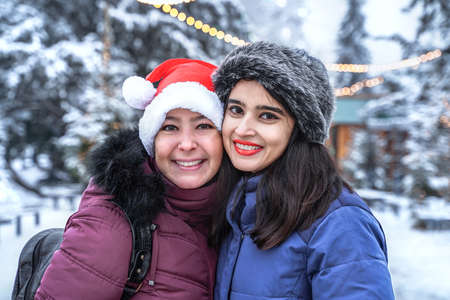 Beautiful young women standing in the winter park. They are wearing warm clothes.