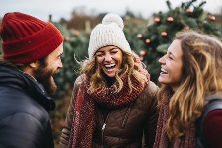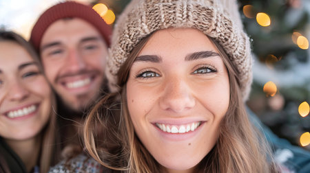 Friends gather together to take a group selfie in front of decorated trees during winter. Everyone smiles and shares a joyful moment outside in the cold.