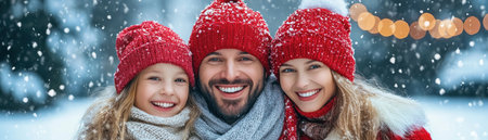 A heartwarming winter wonderland scene unfolds, capturing a joyful family enveloped in warmth and love Snowflakes dance around them as they share smiles and laughter, creating a cozy and cherished memory Their happiness shines through, radiating joy and contentment in this magical winter portrait AI Generative
