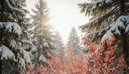 Beautiful winter landscape with snow covered pine trees and red rowan berries
