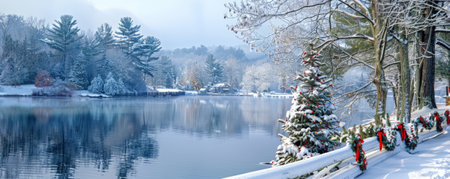 A peaceful winter lake with holiday decorations on the shore and snow-covered trees.