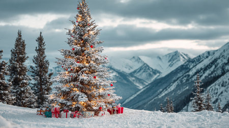 A tall Christmas tree decorated with bright ornaments stands against a serene winter mountain backdrop.