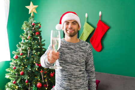 Cheers! Cheerful man looking at the camera during a Christmas party at home and making a toast with champagne