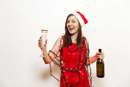 Beautiful charming young smiling happy woman in red dress, Christmas hat, garland lanterns standing with glass and bottle of champagne on white background.