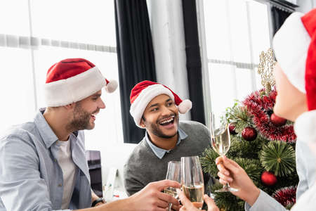 Multiethnic businesspeople toasting with champagne near christmas tree in office