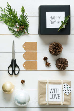 Elegant nordic retro christmas, wrapping station, desk view from above, online shopping concept