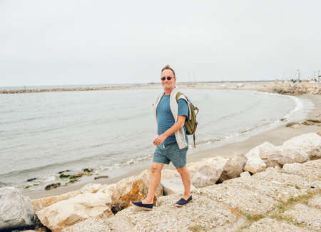 Man enjoying summer vacation by the sea, wearing stripe nautical t-shirt and backpack. Image taken in Saintes-Maries-de-la-Mer, capital of Camargue, south of France