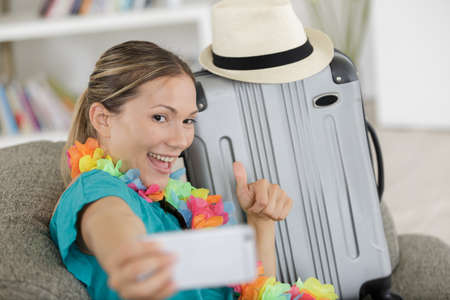 woman selfie happily and sit on sofa in the room