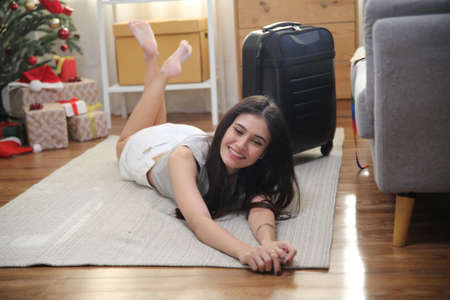 Side view of toothy smiling woman sitting near suitcase with straw hat on it and using smartphone