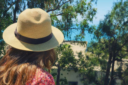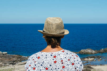 Back view of a woman wearing hat standing and looking in blue ocean.