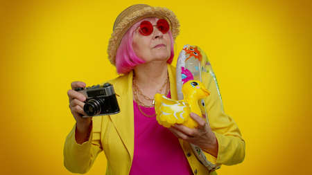 Senior woman granny tourist photographer taking photos on retro camera and smiling on orange background. Travel, summer holiday vacation. Elderly grandmother in sunglasses and hat indoor studio shot