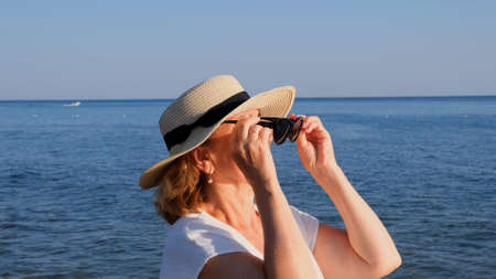 Portrait of a mature woman, age 50, wearing a straw hat and sunglasses against a blue sea background. Summer, vacation, vacation, active retirees.