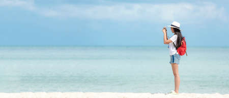 Happy traveler and tourism young women travel summer on the beach. Asian people holding camera take photo and relax outdoor destination and leisure trip travel in holiday. Copy space for banner