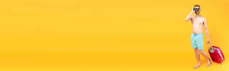 panoramic crop of happy man looking through binoculars and walking with baggage on yellow