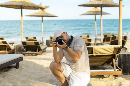 Happy handsome photographer in sunglasses walking with digital camera on beach