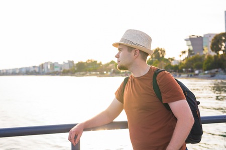 Young traveler man at summer holiday vacation with beautiful mountains and seascapes at background