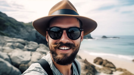 Portrait of a smiling man in hat and sunglasses on the beach