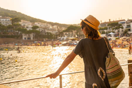 A young tourist at sunset on the coast of Tamariu in the town of Palafrugell. Girona, Costa Brava in the Mediterranean