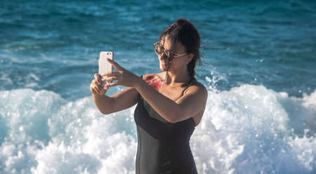 A cheerful woman in a swimsuit takes a selfie against the background of sea waves.