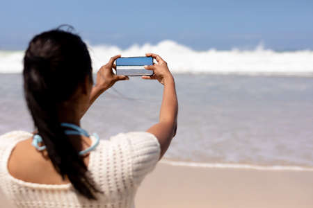 African american woman on a beach taking photo of the sea with smartphone. healthy lifestyle, leisure in nature.