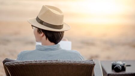 Asian man sitting on beach chair with his film camera at tropical island beach looking at the sea when sunset. Summer holiday or vacation travel concepts