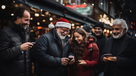 Diverse group of friends enjoying winter season, using smartphones. Festive outdoor gathering in snowy setting, capturing joyful moments and togetherness during the holidays.