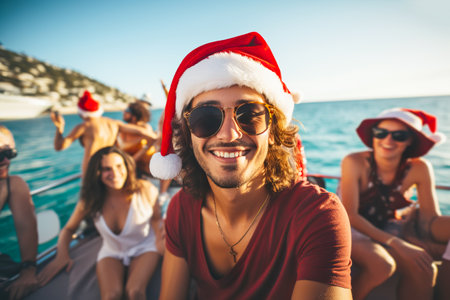Group of friends celebrating Christmas on luxury yacht at exclusive boat party.