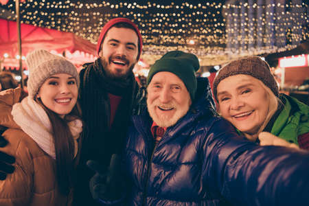 Closeup portrait photo of full family four relatives people x-mas meeting take selfie show v-sign hug outerwear hat scarf coat two generation evening street illumination outdoors outside