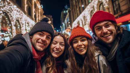 A cheerful group of diverse friends taking a selfie at a Christmas market, filled with twinkling lights, perfect for illustrating holiday joy and togetherness.